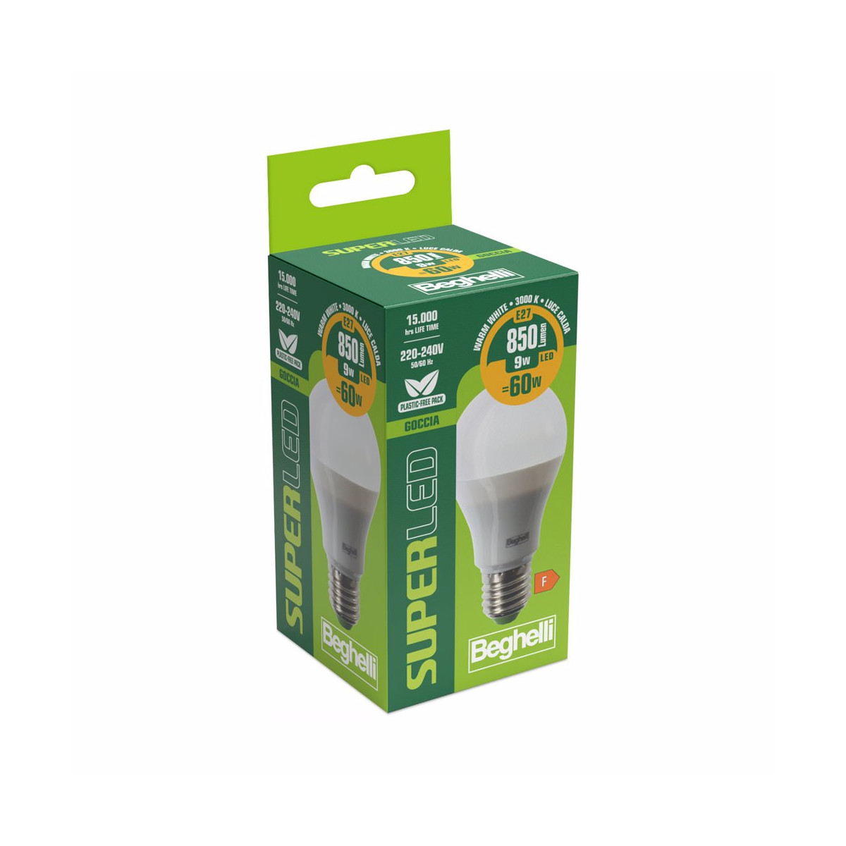 Beghelli SuperLED. Potenza lampadina: 9 W, Lampadina di potenza equivalente: 60 W, Attacco lampada: E27, Flusso luminoso: 850 lm, Durata della lampadina: 15000 h, Colore della luce: Bianco caldo, Temperatura colore: 3000 K, Angolo proiezione: 270°, Color Rendering Index (CRI): 80, Fattore di potenza: 0,51