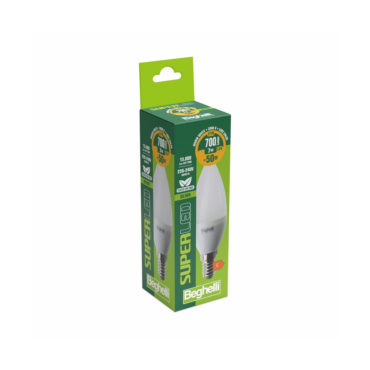 Beghelli SuperLED. Potenza lampadina: 7 W, Lampadina di potenza equivalente: 50 W, Attacco lampada: E14, Flusso luminoso: 700 lm, Durata della lampadina: 15000 h, Colore della luce: Bianco caldo, Temperatura colore: 3000 K, Angolo proiezione: 160°, Color Rendering Index (CRI): 80, Fattore di potenza: 0,51