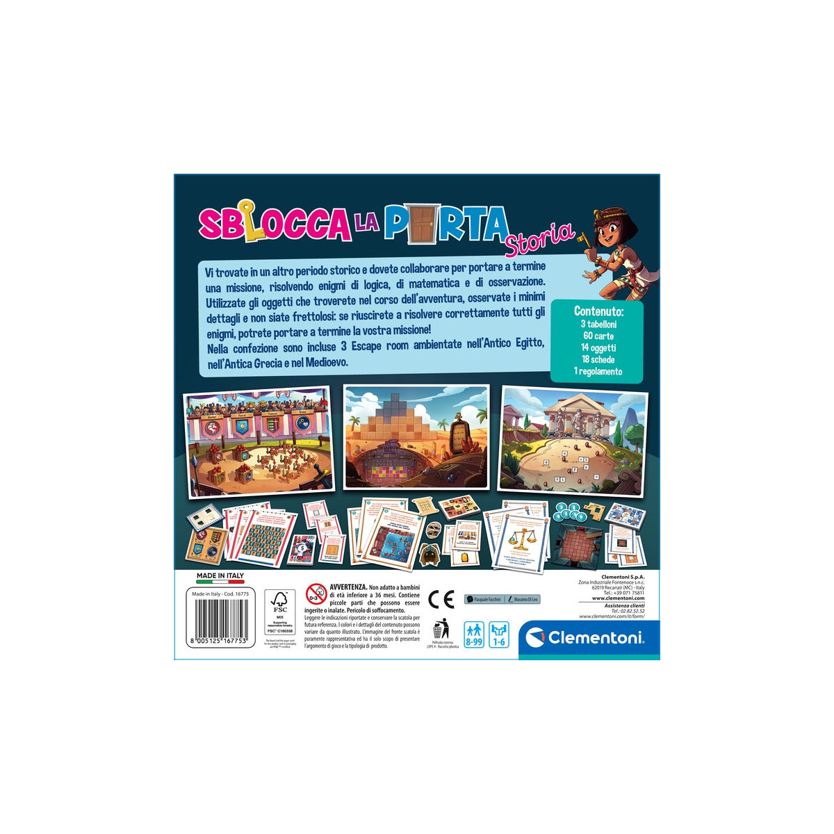 Clementoni SBLOCCA LA PORTA - STORIA. Tipo di prodotto: Carta da gioco, Genere: Viaggio/avventura, Età consigliata (min): 8 anno/i, Tempo di gioco: 30 min, Gioco di famiglia