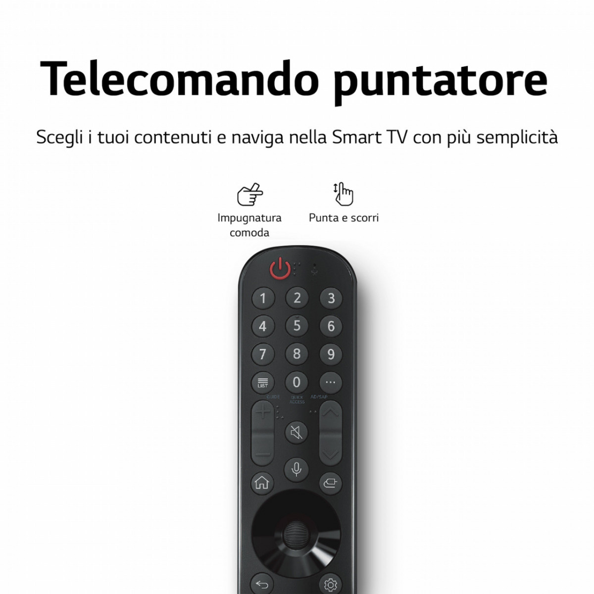 I TV LG QNED sono semplici da usare. Anzi, semplicissimi grazie all'esclusivo telecomando puntatore. Lo impugni come una bacchetta magica e lo usi come un mouse, muovendo il puntatore sullo schermo con un semplice gesto del polso. Così potrai accedere ai tuoi contenuti, navigare su Internet e aprire le app ancora più rapidamente. Il tutto supportato dalla piattaforma Smart TV webOS 22, ancora più intuitiva, completa e intelligente. Così "smart" che da quest'anno mette a tua disposizione una schermata principale diversa per ogni componente della tua famiglia, per consigliare a ciascuno contenuti specifici in base al proprio profilo.