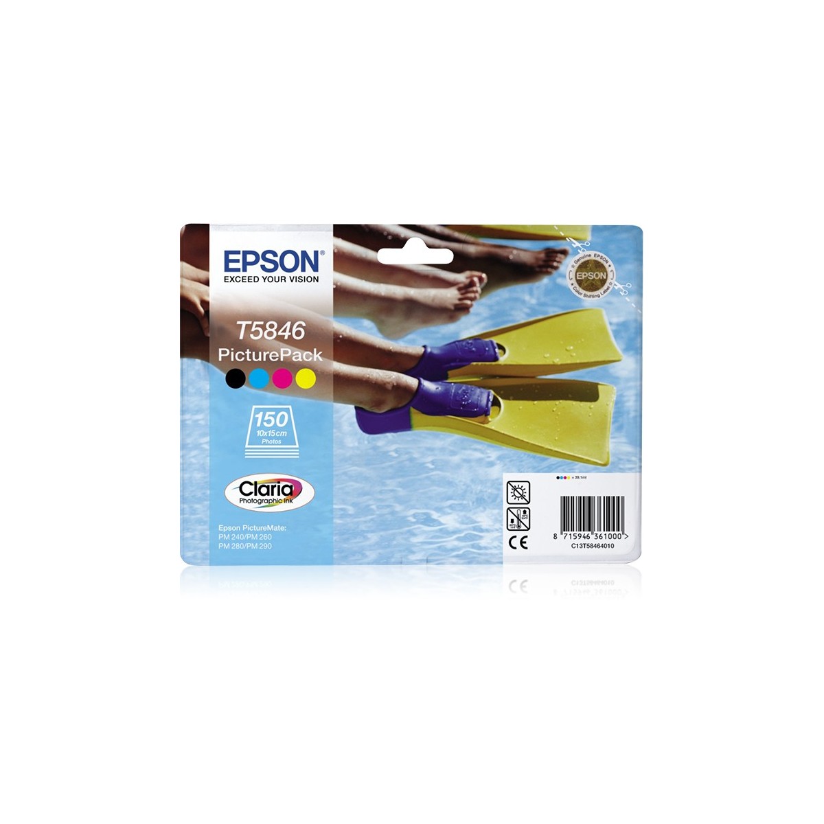 PicturePack T5846 per PictureMate PM240, PM280, PM260, PM290 contenente n.1Cartuccia a 4 colori (39, 1 ml) e 150 fogli di carta fotografica in formato 10x15 (4x6"), in confezione blister RS.