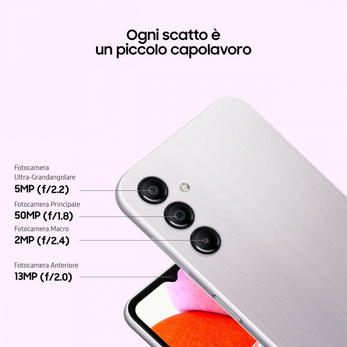 Galaxy A14 è lo smartphone con rete LTE che ti permette di scattare selfie indimenticabili, con il design distintivo della serie Galaxy