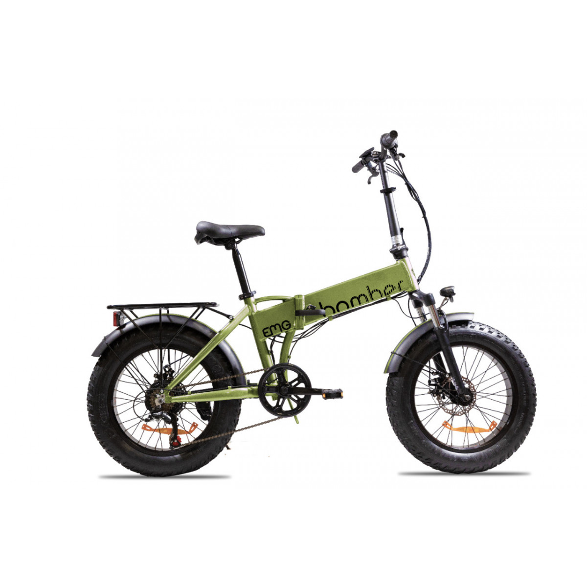 EMG Fat Bike Bomber 250W con telaio 17" foldable, ruota 20", Freni a disco a/p, Cambio Shimano e batteria 10Ah. Capacità della batteria: 10 Ah, Autonomia della batteria (con pedalata assistita): 40 km, Voltaggio della batteria: 36 V. Peso (batteria inclusa): 29 kg, Larghezza: 1680 mm, Profondità: 580 mm. Materiale del telaio: Alluminio
