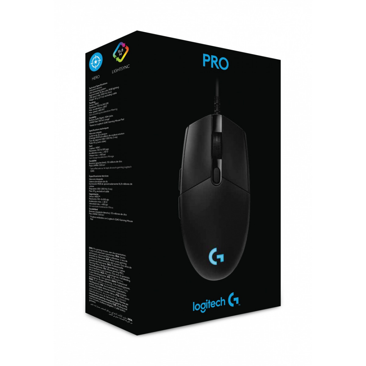 Logitech PRO HERO. Fattore di forma: Mano destra. Tecnologia di rilevamento del movimento: Ottico, Interfaccia dispositivo: USB tipo A, Risoluzione movimento: 16000 DPI, Tipo di pulsanti: Tasti premuti, Numero di tasti: 6, Tipo di scorimmento: Rotella, Accelerazione (max): 40 G. colore d'illuminazione: Multi. Alimentazione: Cavo. Colore del prodotto: Nero