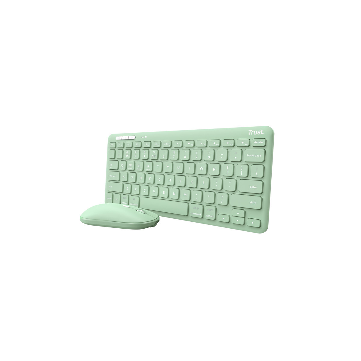 Trust Lyra. Fattore di forma tastiera: Mini. Stile tastiera: Dritto. Tecnologia di connessione: Wireless, Interfaccia dispositivo: RF senza fili + Bluetooth, Interruttore a chiave per tastiera: Tasto con meccanismo a forbici, Struttura tastiera: QWERTY, Utilizzo raccomandato: Universale. Colore del prodotto: Verde. Mouse incluso