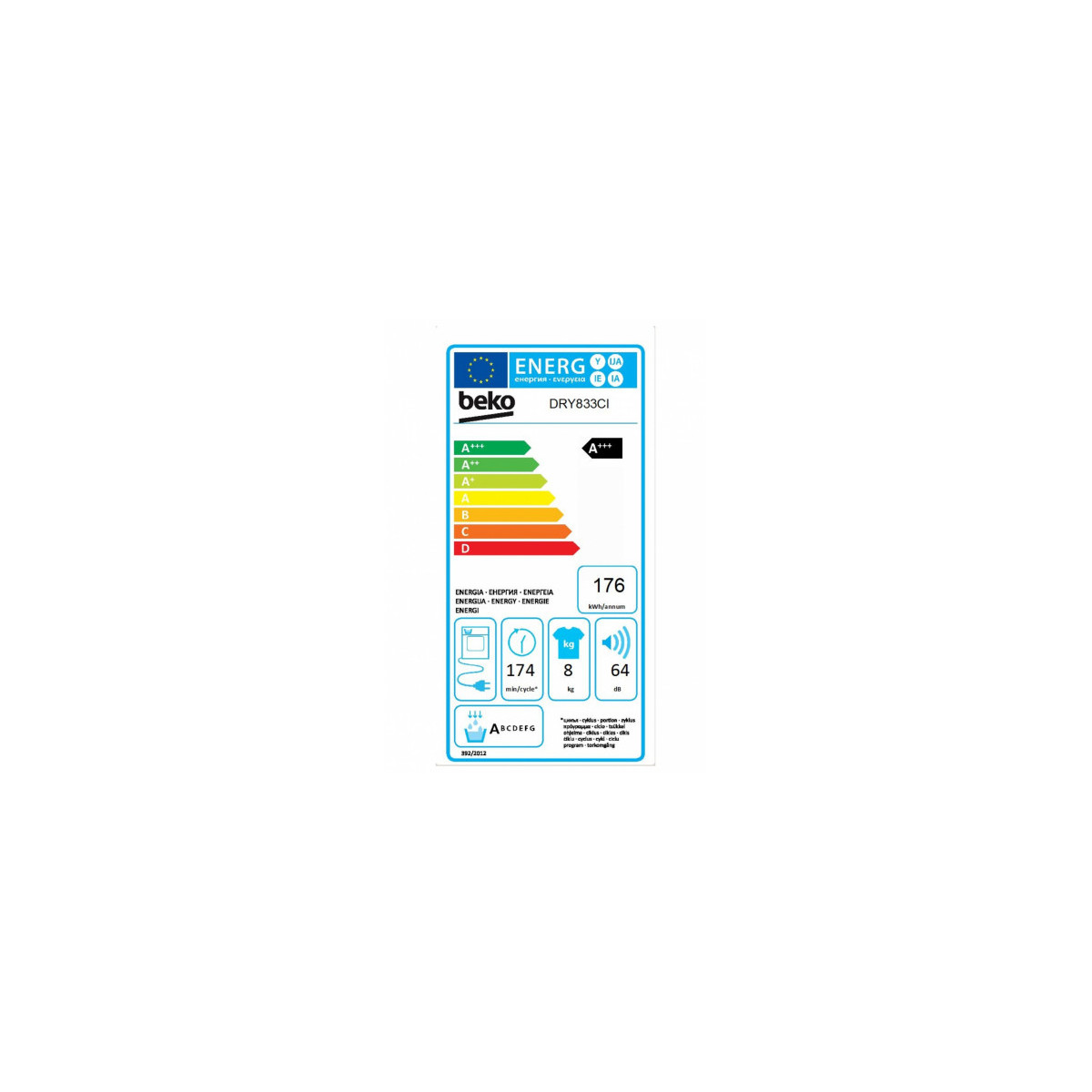 Caratteristiche Tecniche: Asciugatrice a Pompa di Calore Beko DRY833CI Classe di Efficienza Energetica A+++ Capacità di Carico 8 Kg Display Digitale Luce Interna Cestello Motore Inverter Programma Lana Woolmark Oblo' Reversibile Partenza Ritardata 24 h Indicazione Tempo Residuo Allarme Segnalazione Ottica Filtro Sporco Segnalazione Ottica Vaschetta Condensa Piena 16 Programmi di Asciugatura, tra cui: Asciugatura Lana Asciugatura Rapida Asciugatura FreshUp Asciugatura Delicati e Seta Asciugatura Jeans Asciugatura Cotone Asciugatura Capi Sintetci Dimensioni: Altezza 84.6 cm Larghezza 59 cm Profondità 60.9 cm