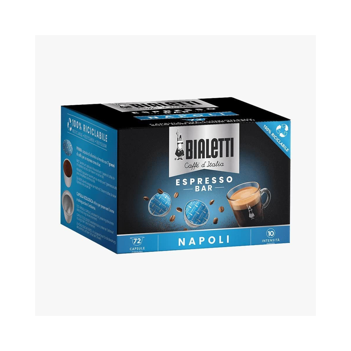 Bialetti Napoli. Tipo di prodotto: Capsule caffè, Tipologie di bevande: Espresso, Livello di tostatura del caffè: Tostatura scura. Peso: 7 g. Peso dell'imballo: 504 g, Tipo di imballo: Scatola. Quantità per pacco: 72 pz