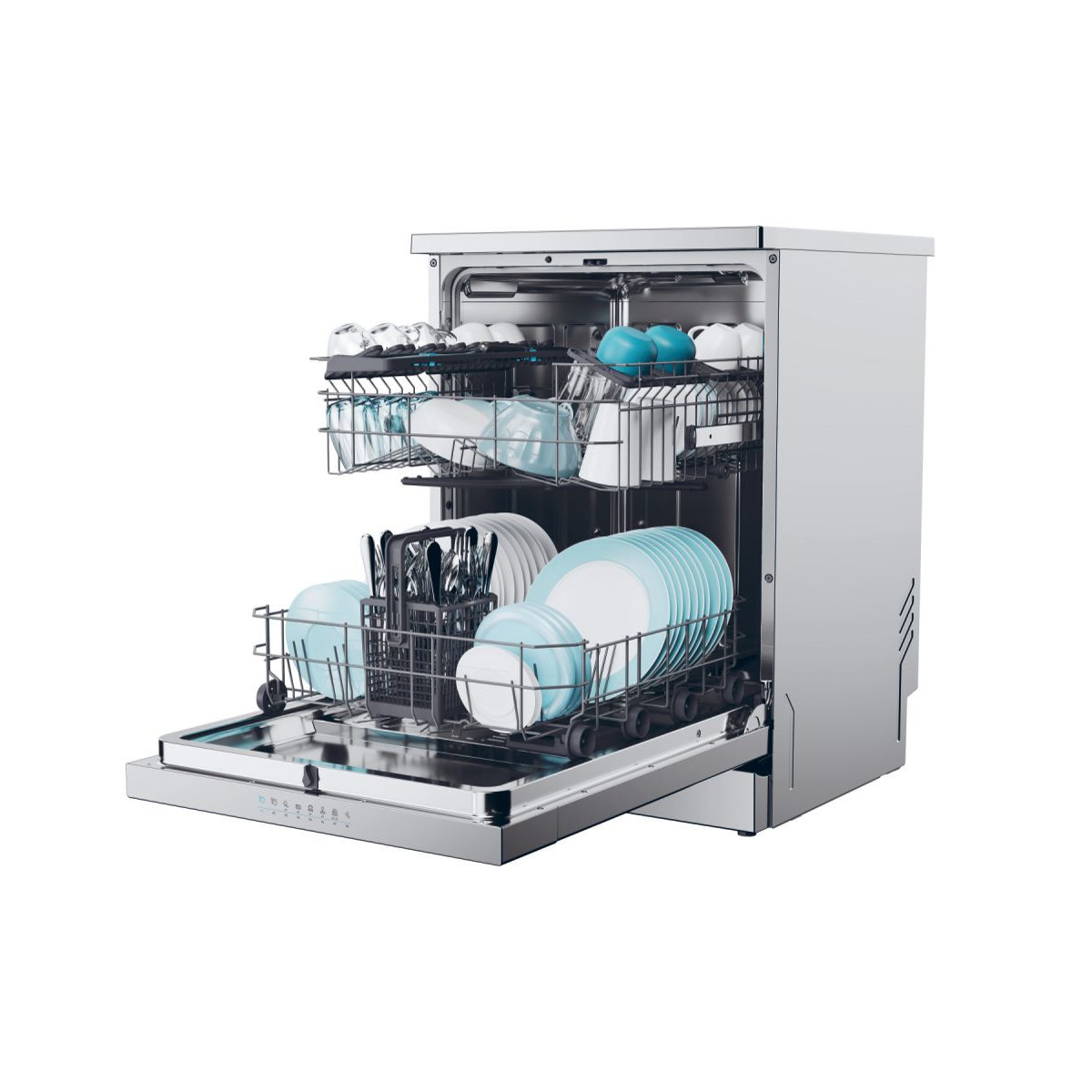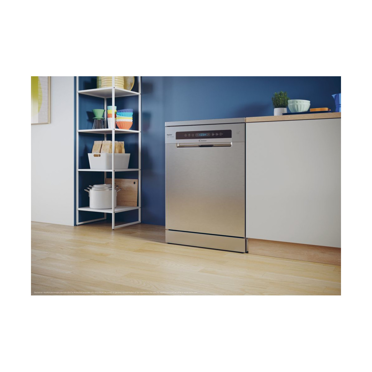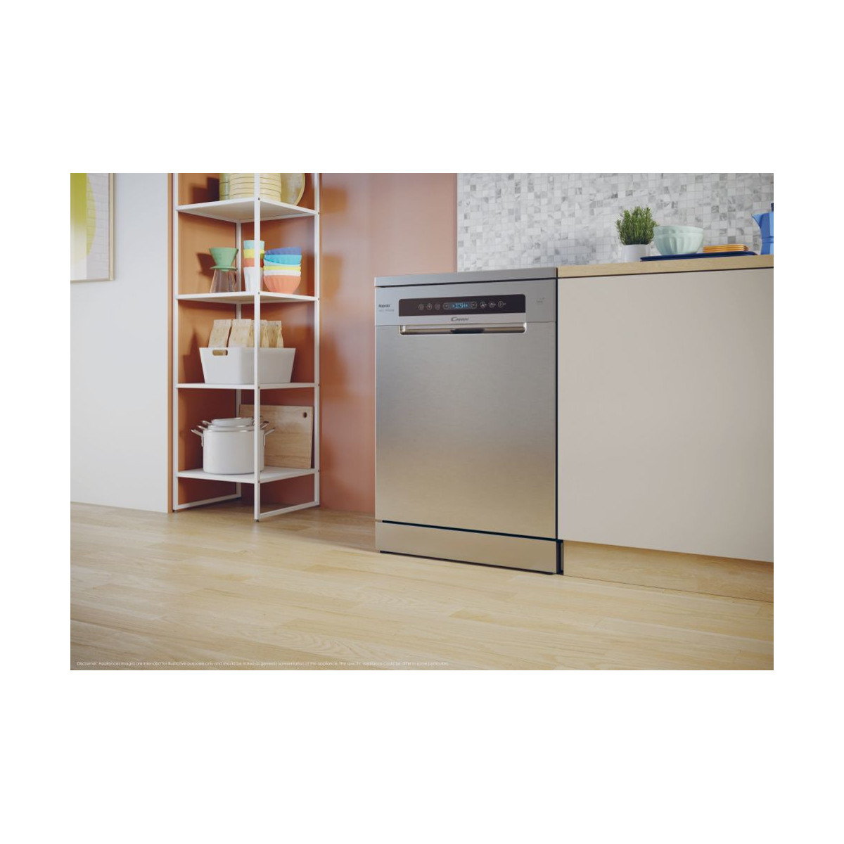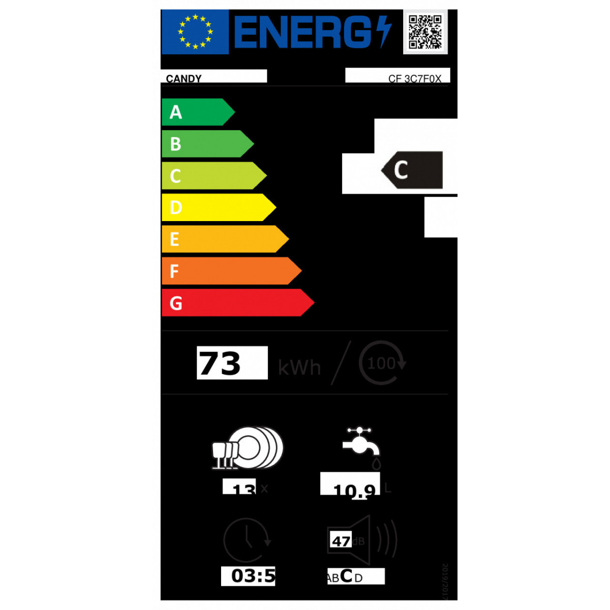 Candy RapidÓ CF 3C7F0X. Posizionamento dell'apparecchio: Libera installazione, Dimensione: Dimensione massima (60 cm), Colore della porta: Acciaio inossidabile. Numero di coperti: 13 coperti, Classe emissione rumore: C, Emissione acustica: 47 dB. Applicazioni per il controllo supportate: hOn. Classe efficienza energetica: C, Consumo di acqua per ciclo: 10,9 L, Consumo energetico per 100 cicli: 73 kWh. Larghezza: 597 mm, Profondità: 598 mm, Altezza: 850 mm