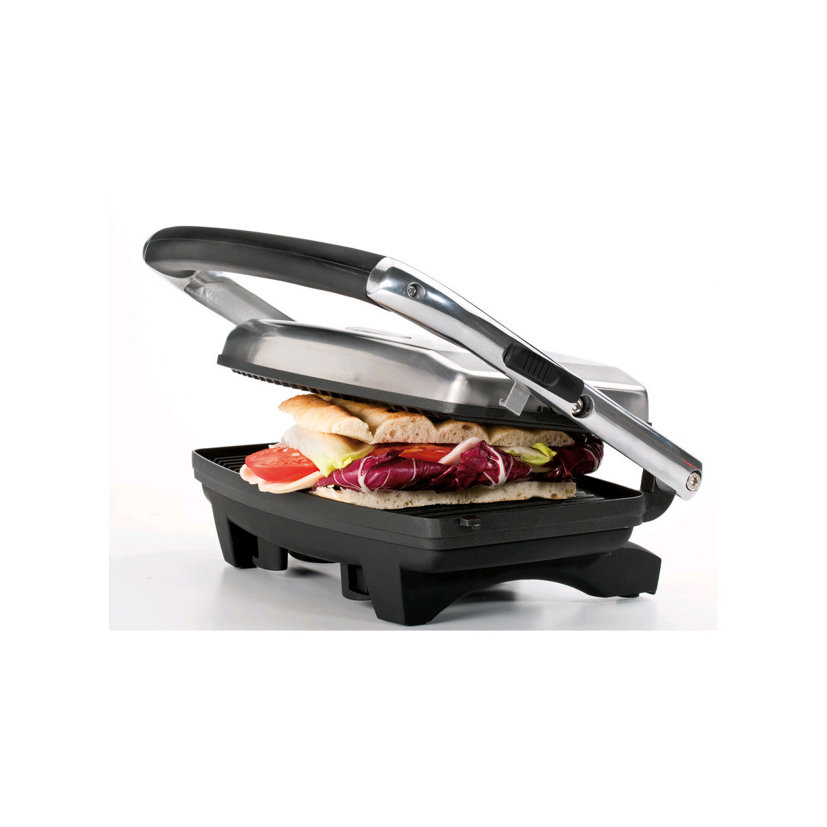 Piastra elettrica antiaderente rigata per preparare ottimi sandwich, panini, hot dog, hamburger o spiedini grazie alla forma compatta ed elegante è una aiuto prezioso in cucina.