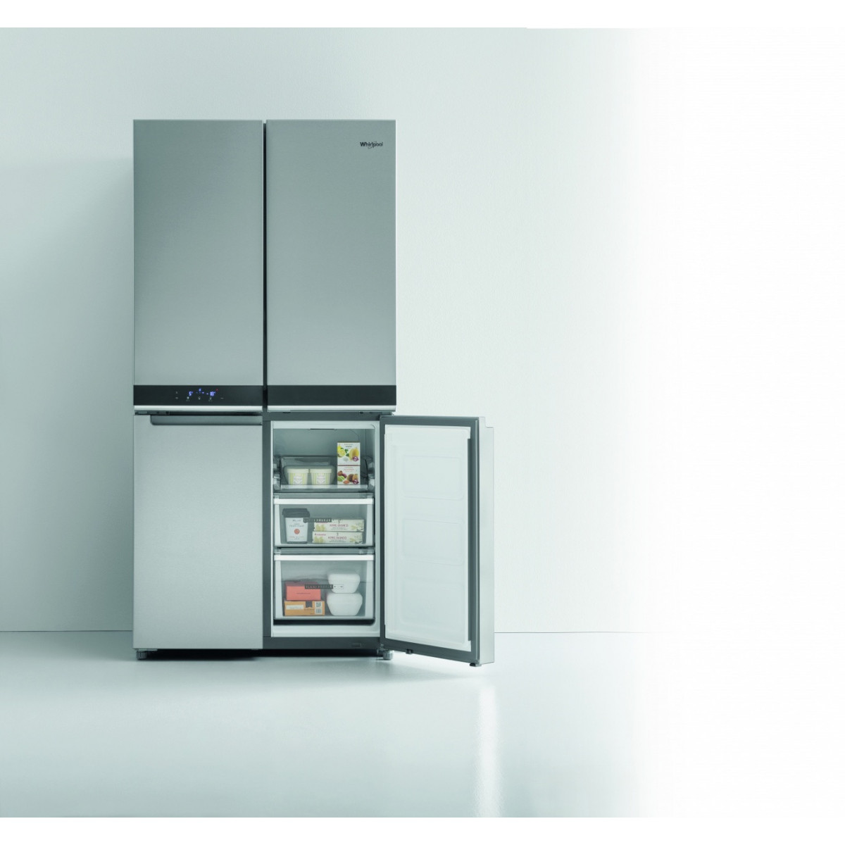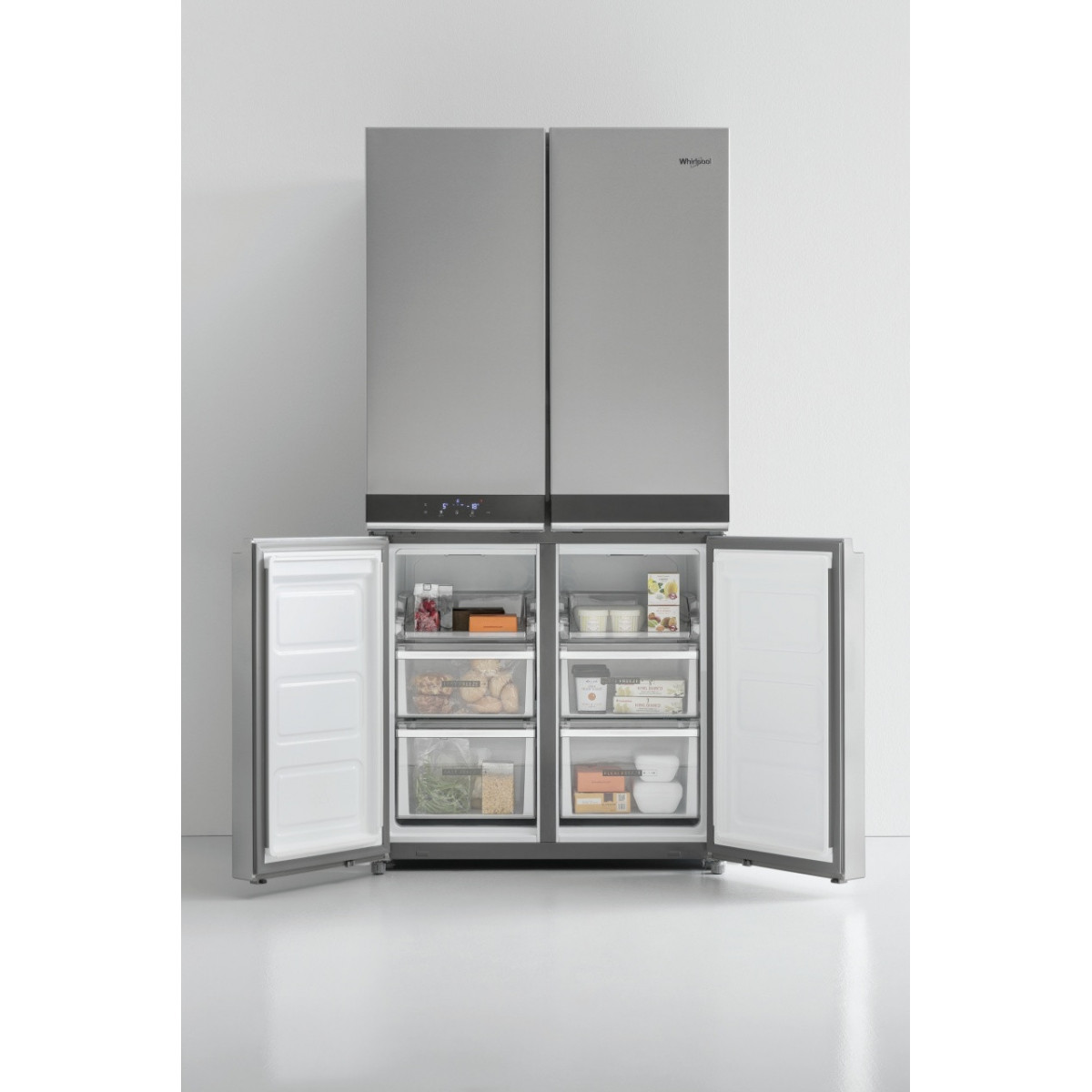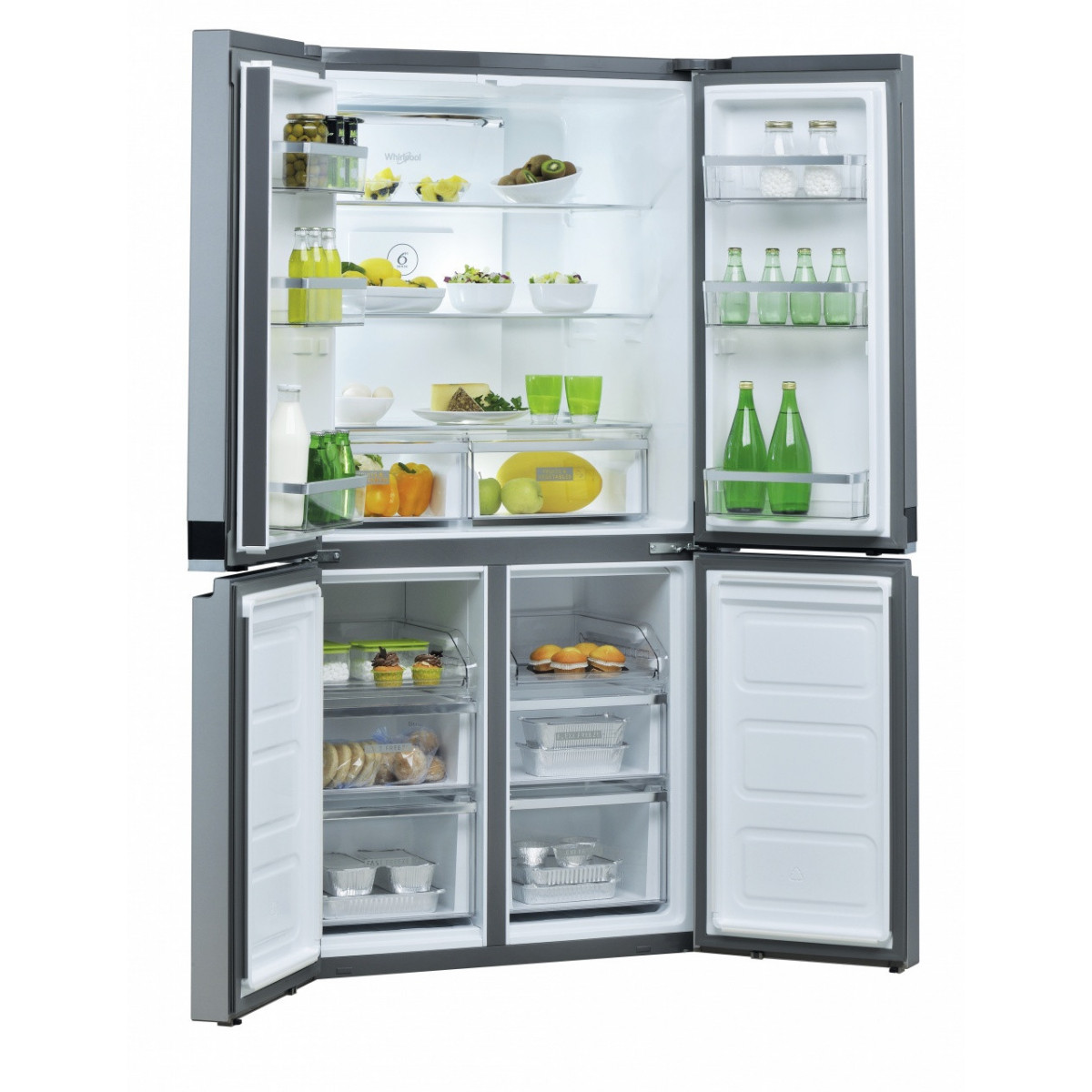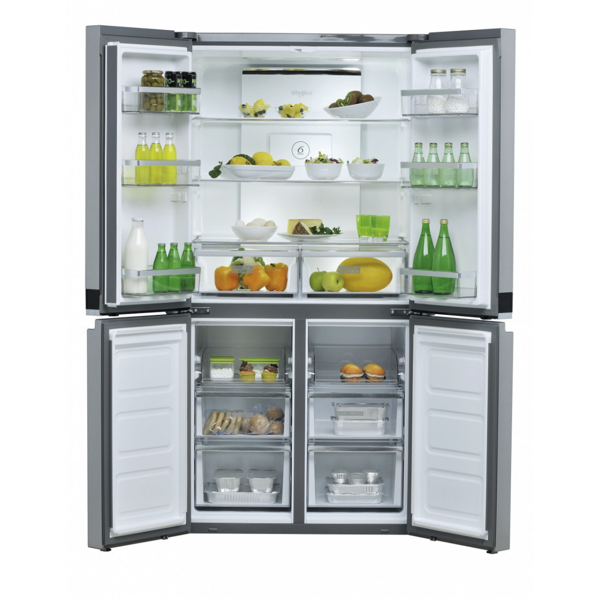Whirlpool WQ9 B1L. Posizionamento dell'apparecchio: Libera installazione, Colore del prodotto: Acciaio inossidabile, Design: Porta francese. Capacità netta totale: 594 L, Classe climatica: SN-T, Emissione acustica: 37 dB. Capacità netta frigorifero: 388 L, Capacità lorda frigorifero: 409 L. Capacità netta congelatore: 206 L, Posizione del congelatore: Posto in basso, Capacità di congelamento: 10 kg/24h. Lunghezza cavo: 1,8 m