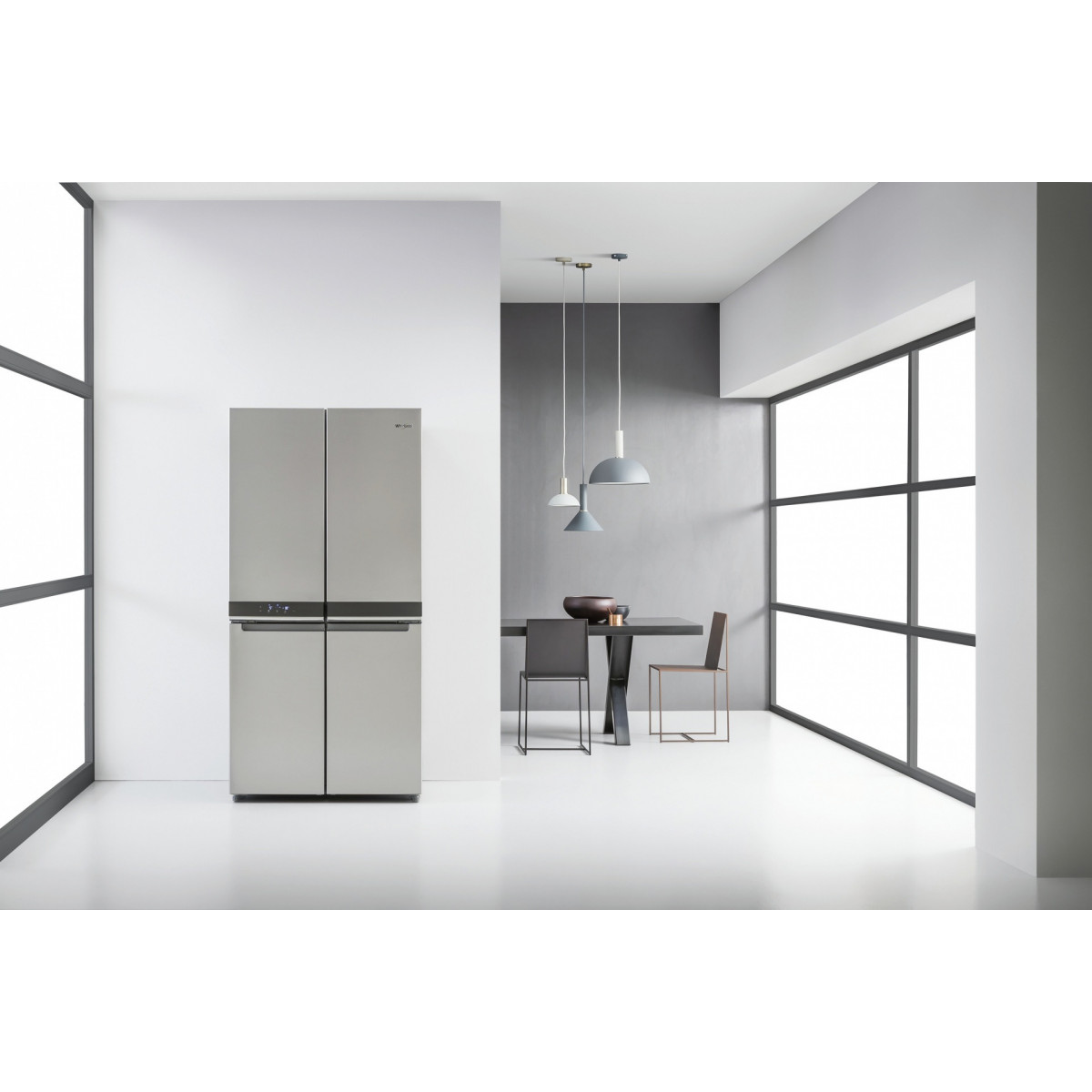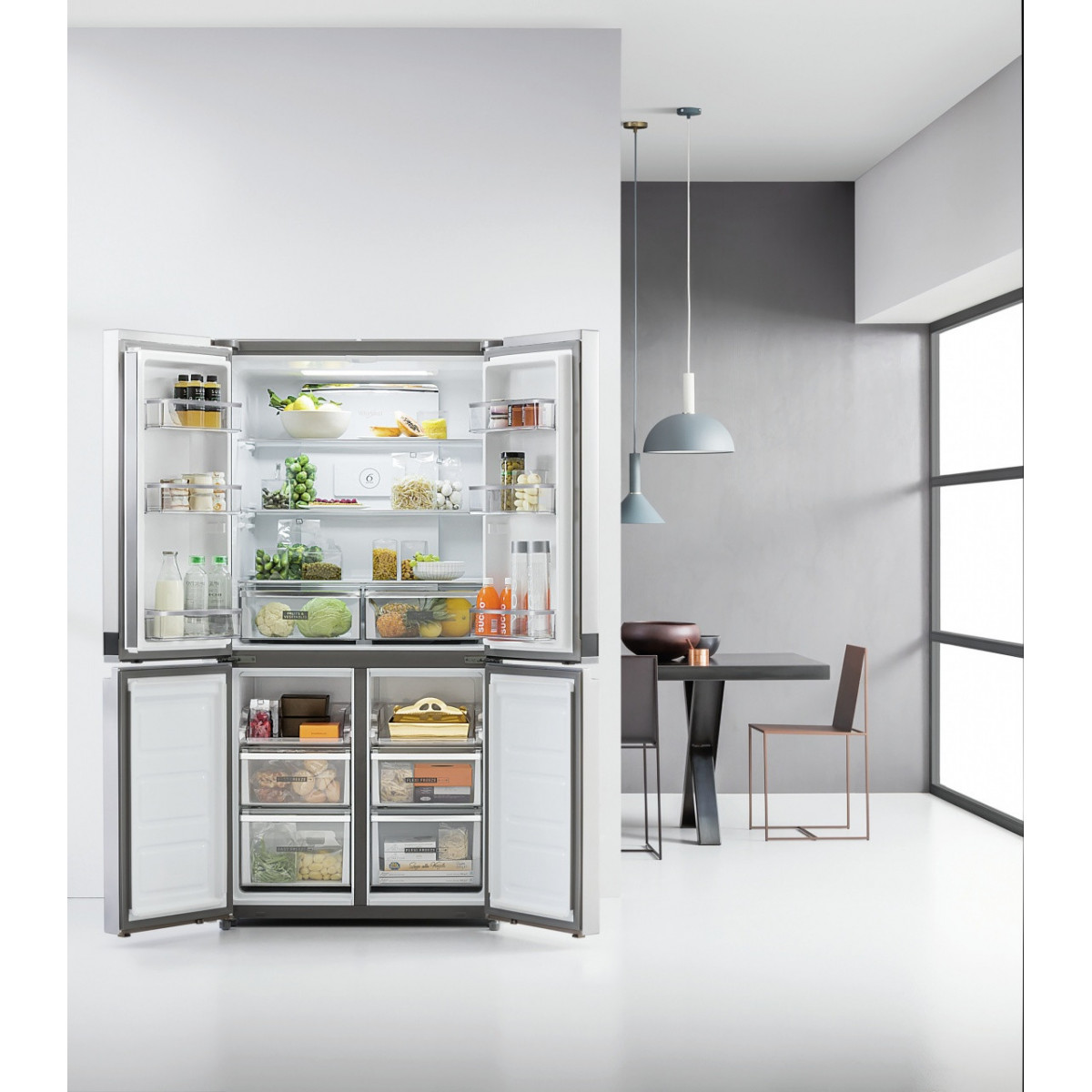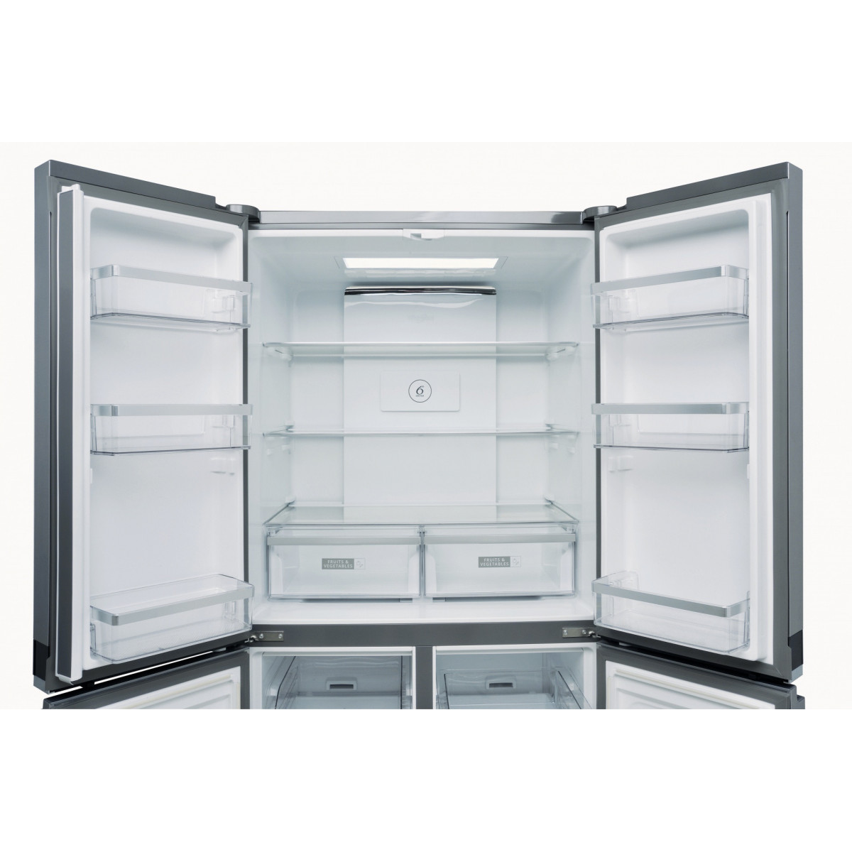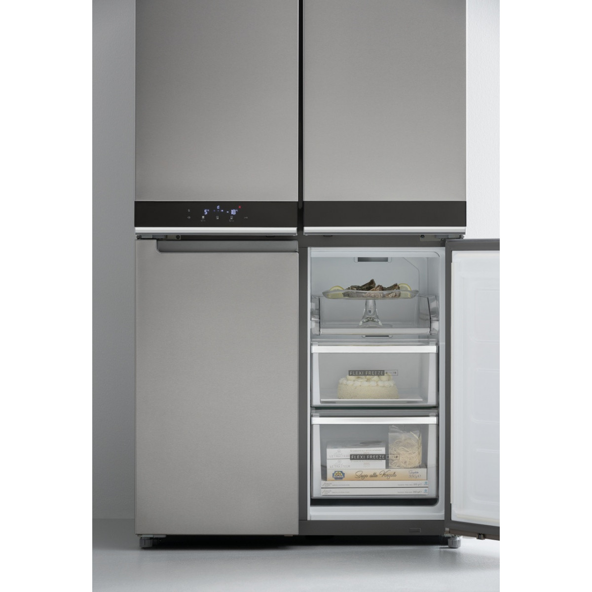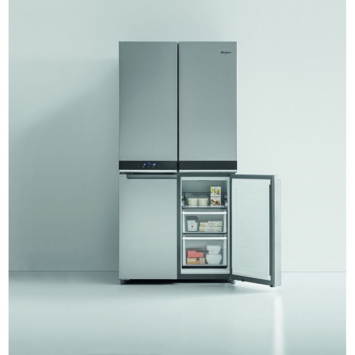 Whirlpool WQ9 B1L. Posizionamento dell'apparecchio: Libera installazione, Colore del prodotto: Acciaio inossidabile, Design: Porta francese. Capacità netta totale: 594 L, Classe climatica: SN-T, Emissione acustica: 37 dB. Capacità netta frigorifero: 388 L, Capacità lorda frigorifero: 409 L. Capacità netta congelatore: 206 L, Posizione del congelatore: Posto in basso, Capacità di congelamento: 10 kg/24h. Lunghezza cavo: 1,8 m