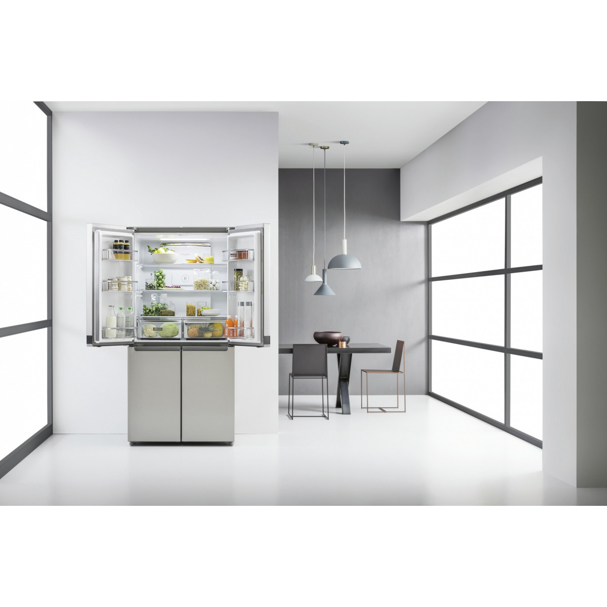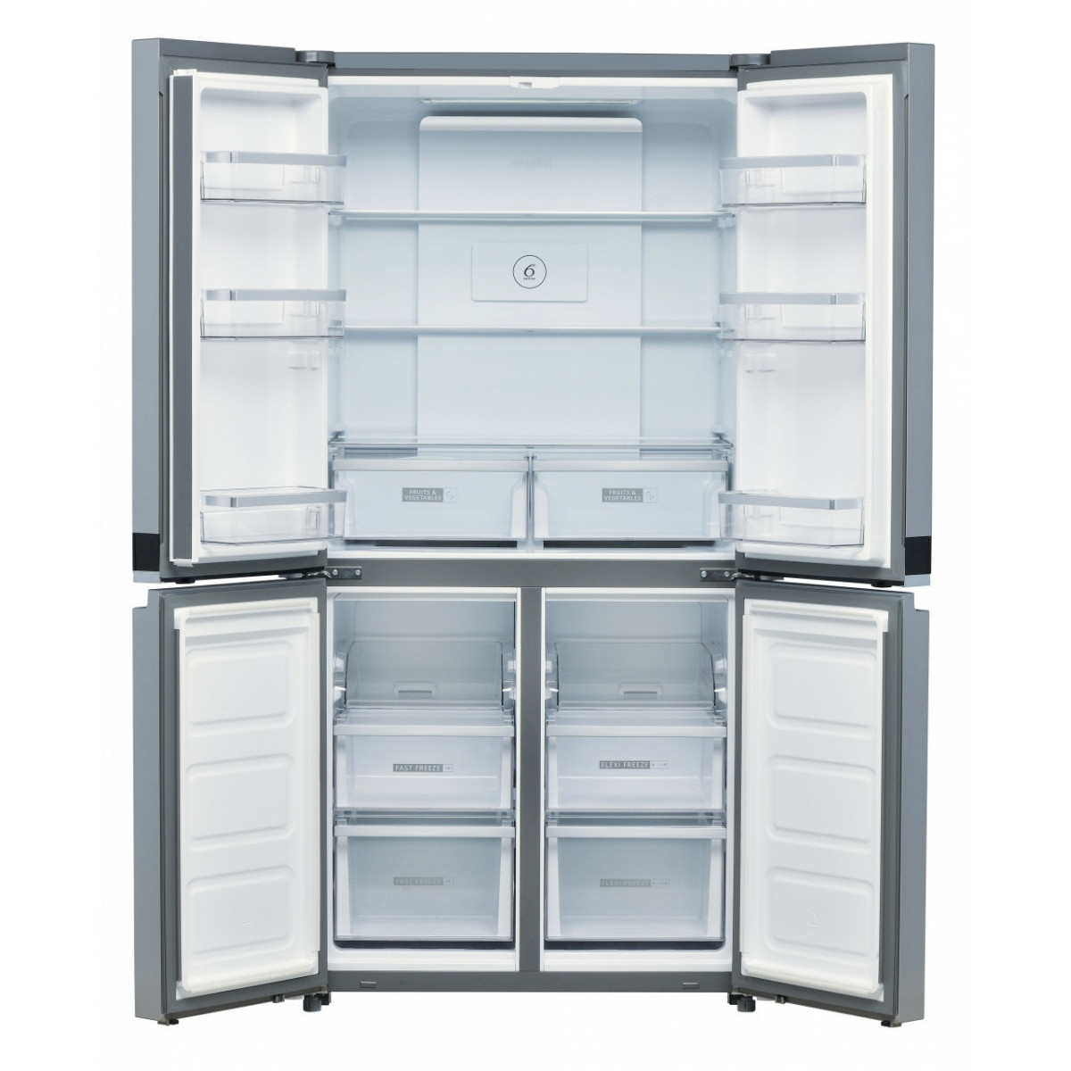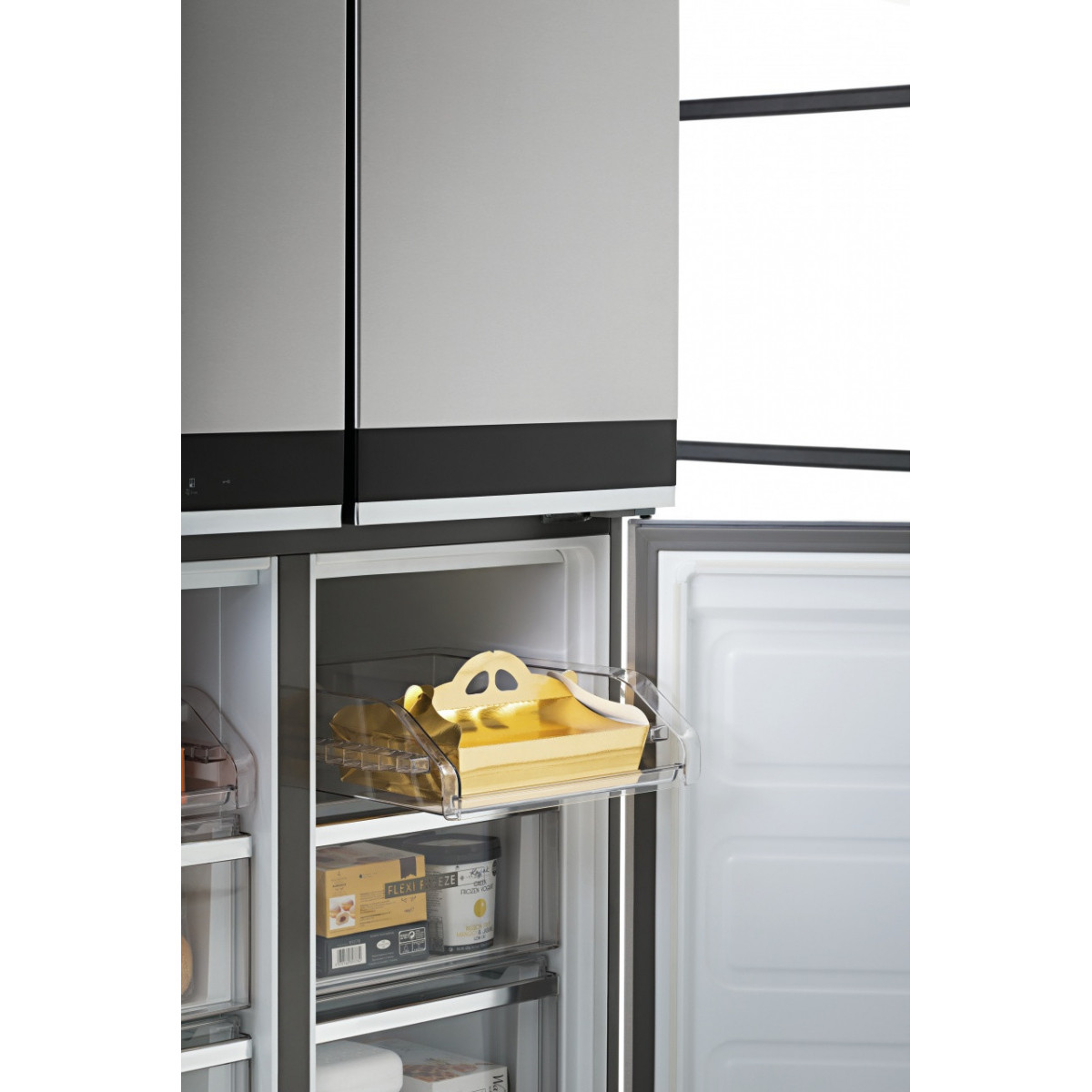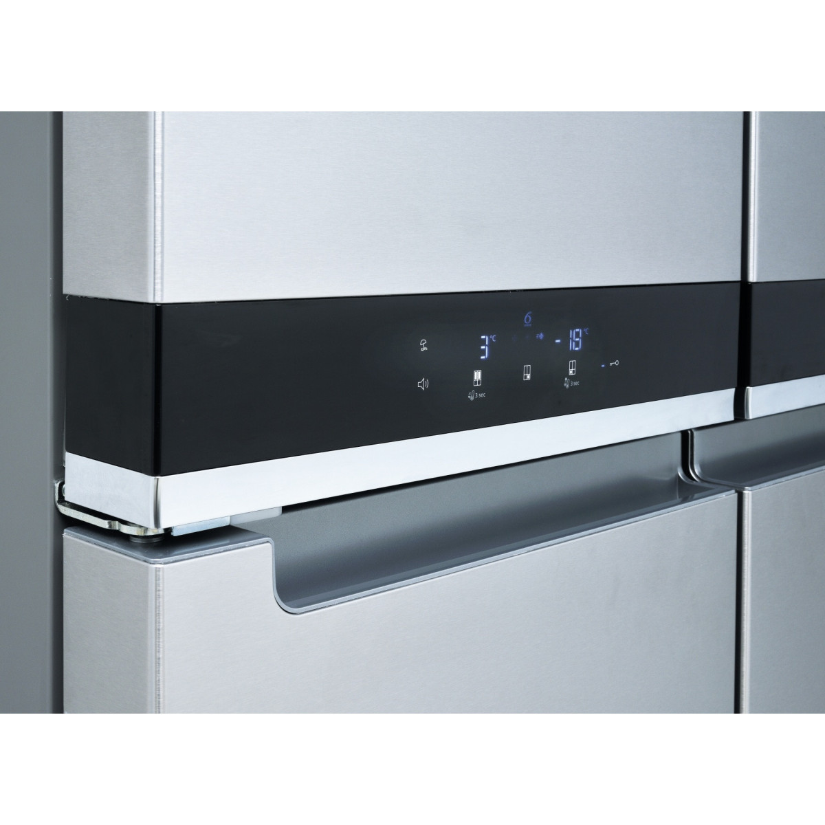 Whirlpool WQ9 B1L. Posizionamento dell'apparecchio: Libera installazione, Colore del prodotto: Acciaio inossidabile, Design: Porta francese. Capacità netta totale: 594 L, Classe climatica: SN-T, Emissione acustica: 37 dB. Capacità netta frigorifero: 388 L, Capacità lorda frigorifero: 409 L. Capacità netta congelatore: 206 L, Posizione del congelatore: Posto in basso, Capacità di congelamento: 10 kg/24h. Lunghezza cavo: 1,8 m