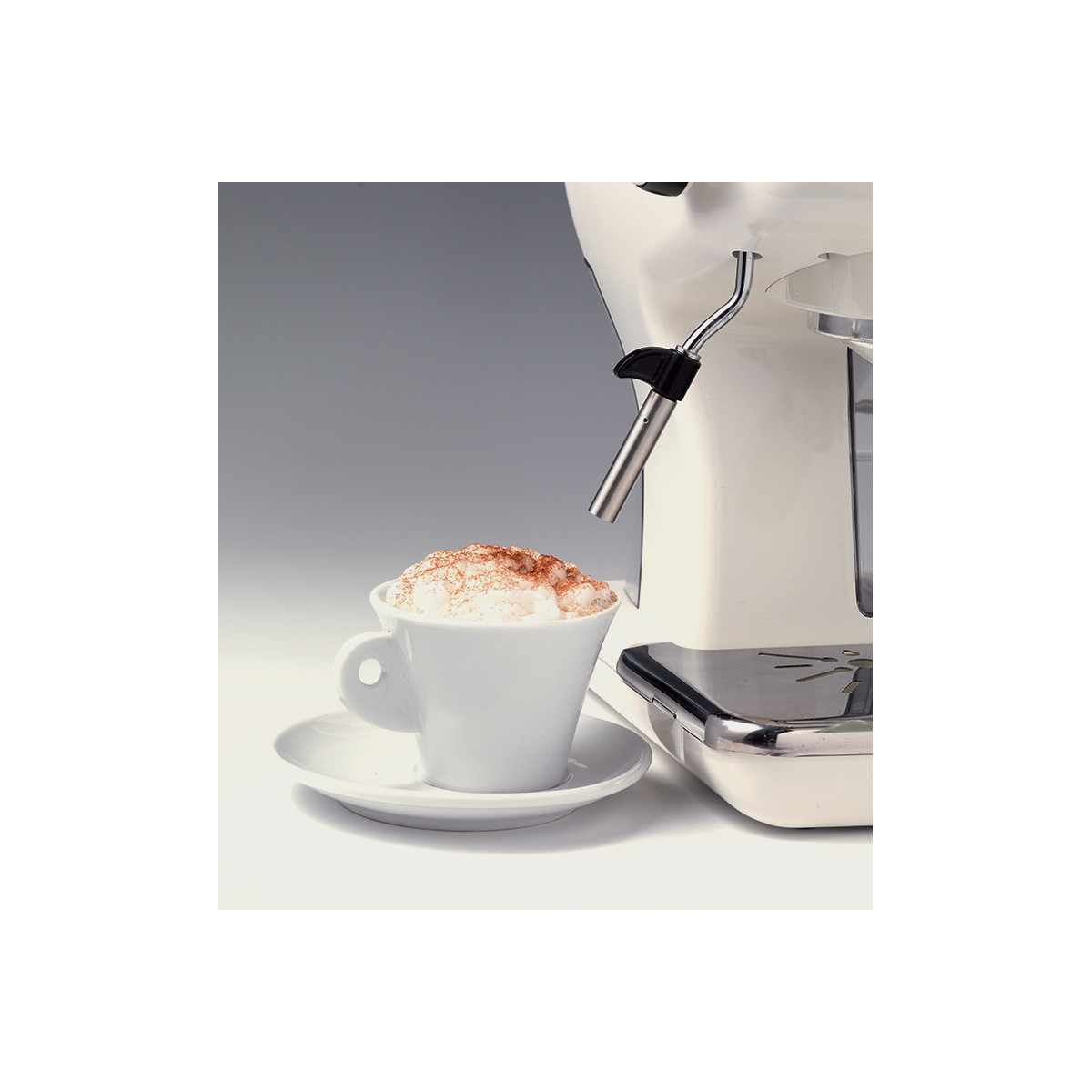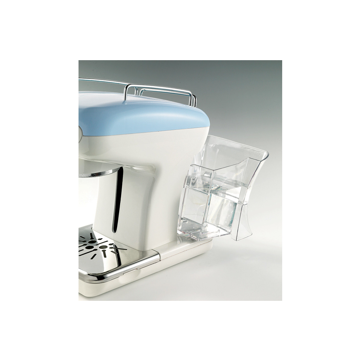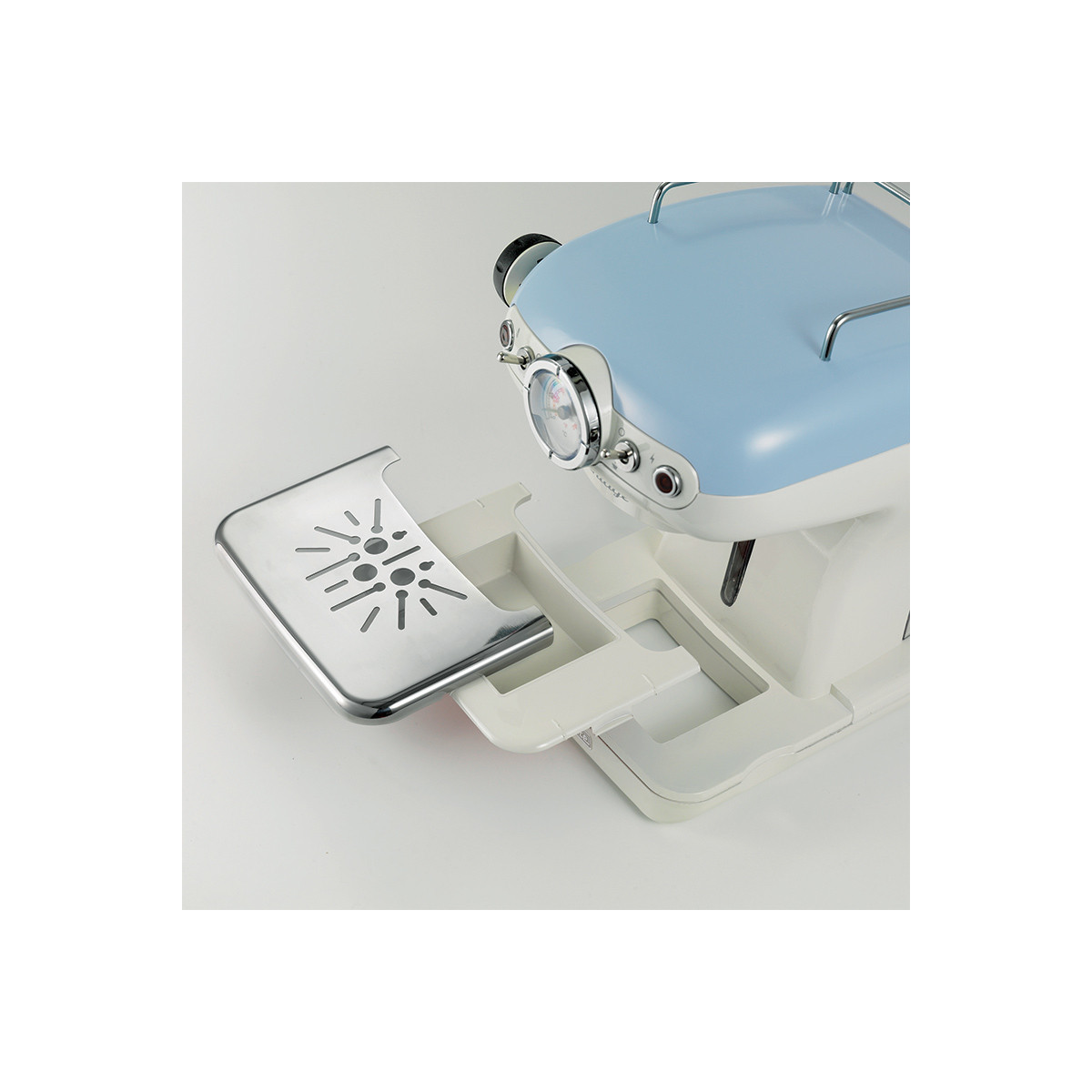 Macchina per caffè espresso dal design elegante e raffinato, in perfetto stile vintage, arricchita dai preziosi dettagli pastello con finiture in metallo. Con i suoi 900W di potenza, 15 bar di pressione, portafiltro per cialda e polvere (1 e 2 tazze), vassoio e contenitore acqua estraibili, permette di gustare a casa caffè e cappuccini cremosi e intensi come quelli del bar.