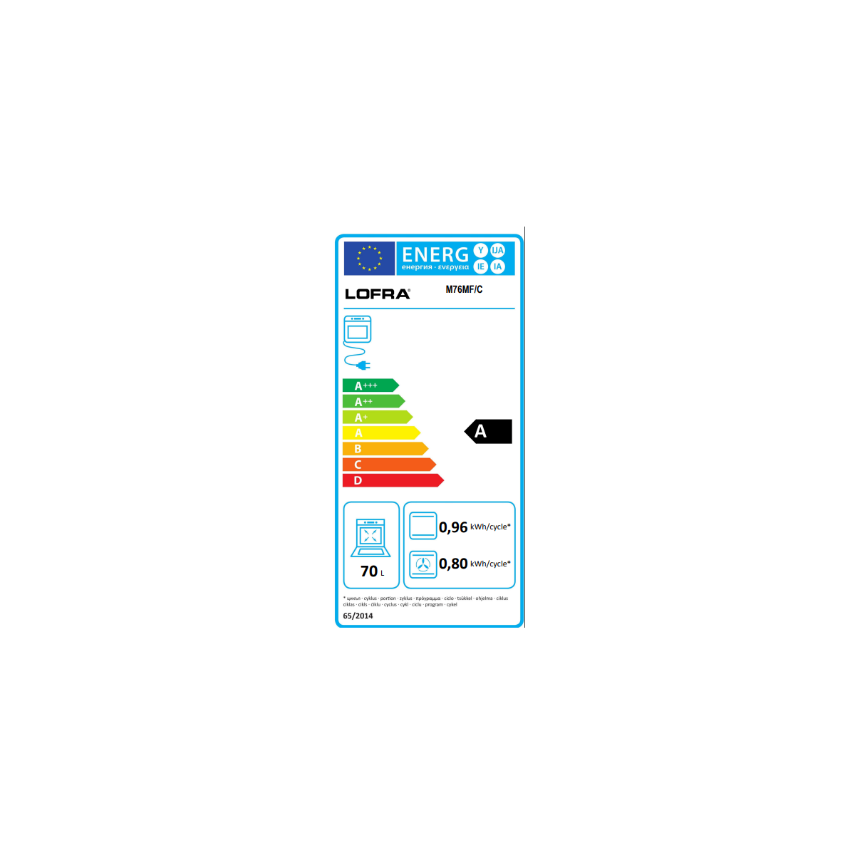 Lofra M76MF/C. Tipo di prodotto: Piano cottura, Colore del prodotto: Acciaio inossidabile, Tipo di controllo: Manopola. Tipo di piano cottura: Gas, Numero totale elementi piano cottura: 5 Fornello(i), Numero di fornelli a gas: 5 Fornello(i). Dimensione del forno: Media, Sorgente di alimentazione del forno: Elettrico, Capacità netta del forno: 66 L. Tipo di timer: Meccanico. Classe efficienza energetica: A, Consumo energetico (convenzionale): 0,96 kWh