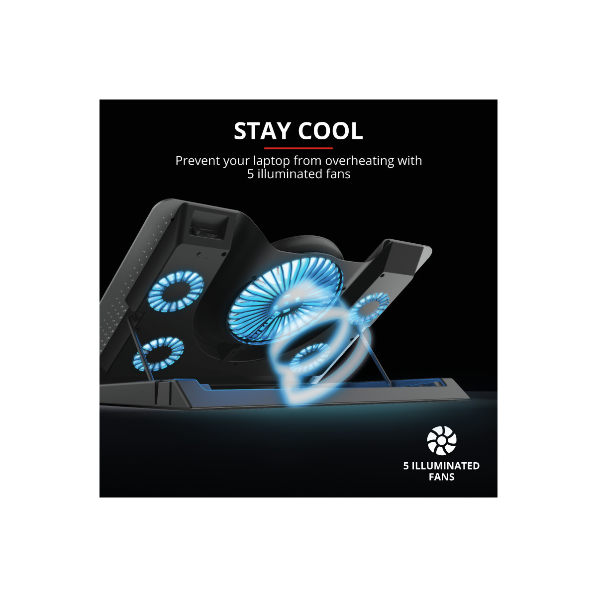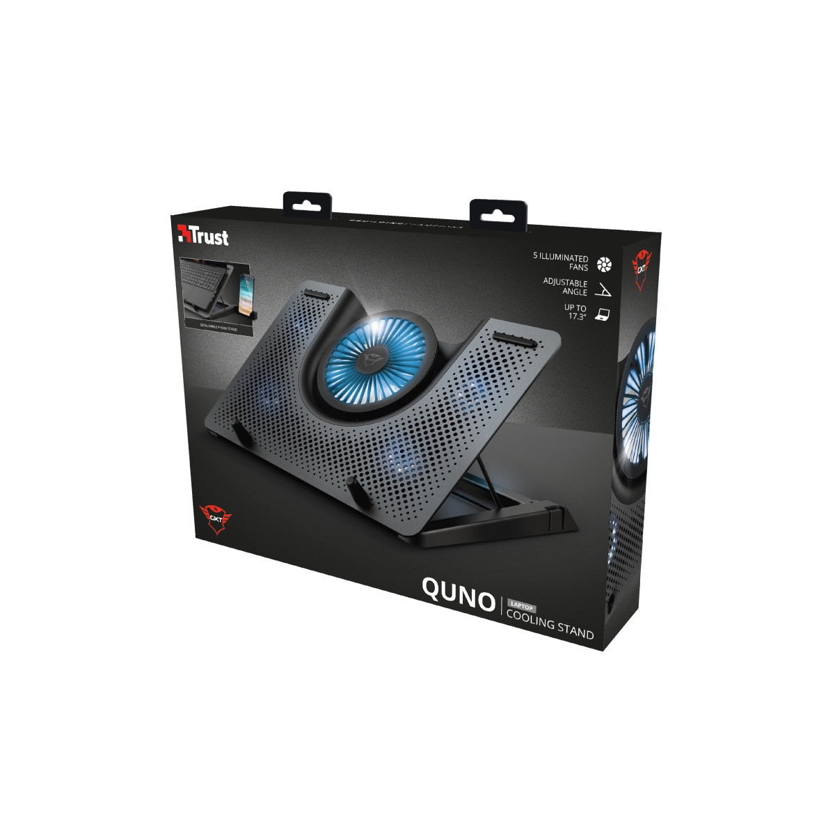Trust GXT 1125 Quno. Tipo di prodotto: Supporto per computer portatile, Colore del prodotto: Nero, Dimensione massima compatibile dello schermo del notebook: 43,2 cm (17"). Numero di ventilatori già presenti: 5 pezzo(i), Diametro del ventilatore: 5 cm, Emissione acustica: 45 dB. Portanza: 190 cm. Larghezza: 400 mm, Profondità: 280 mm, Altezza: 50 mm