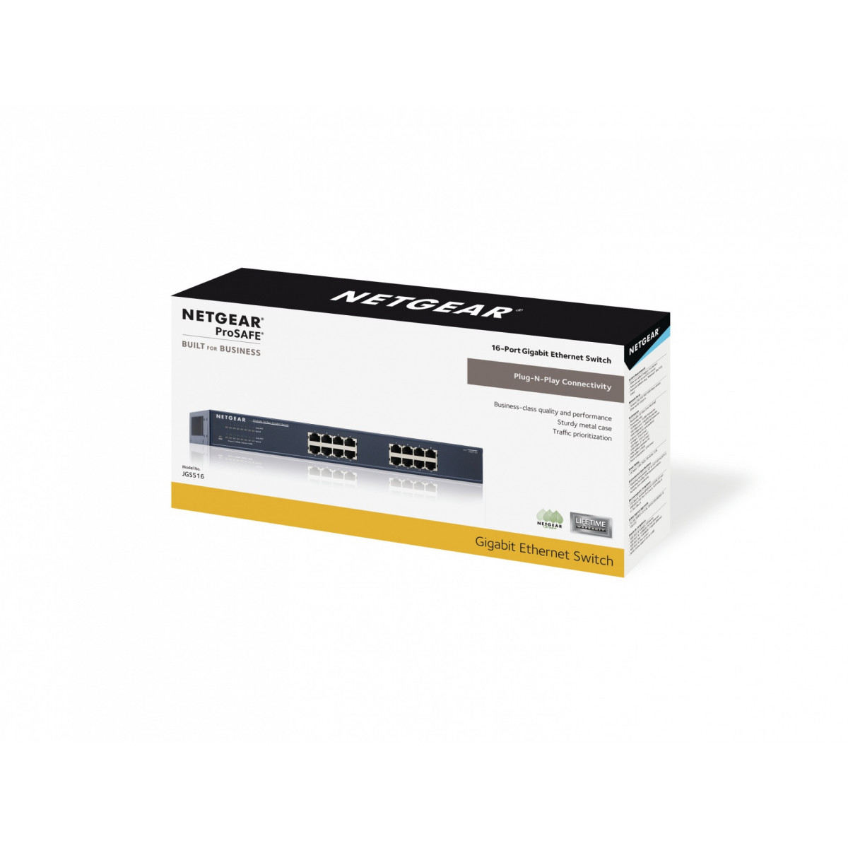 Netgear JGS516. Tipo interruttore: Non gestito. Quantità di porte RJ-45: 16, Connettore di alimentazione: Jack DC-ingresso
