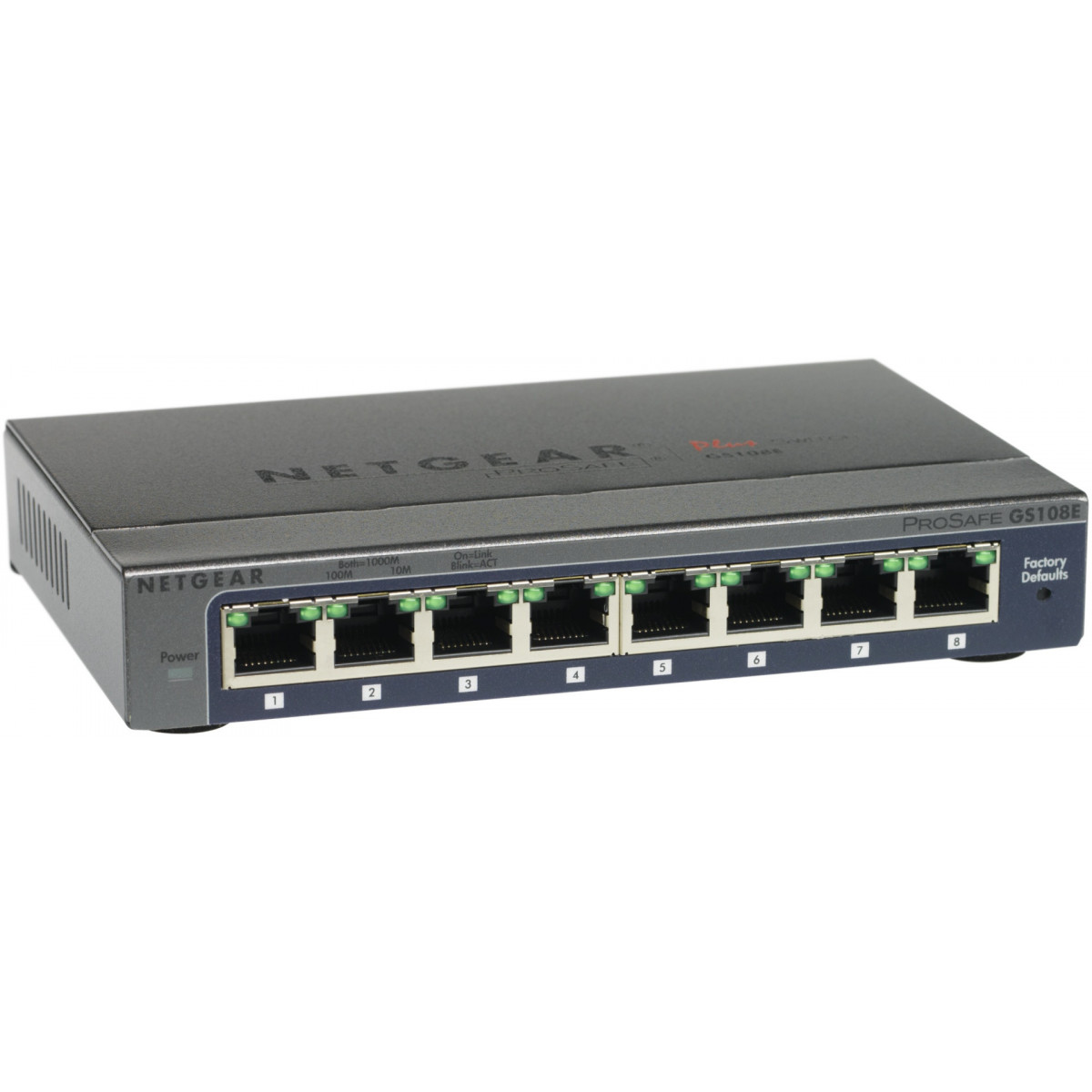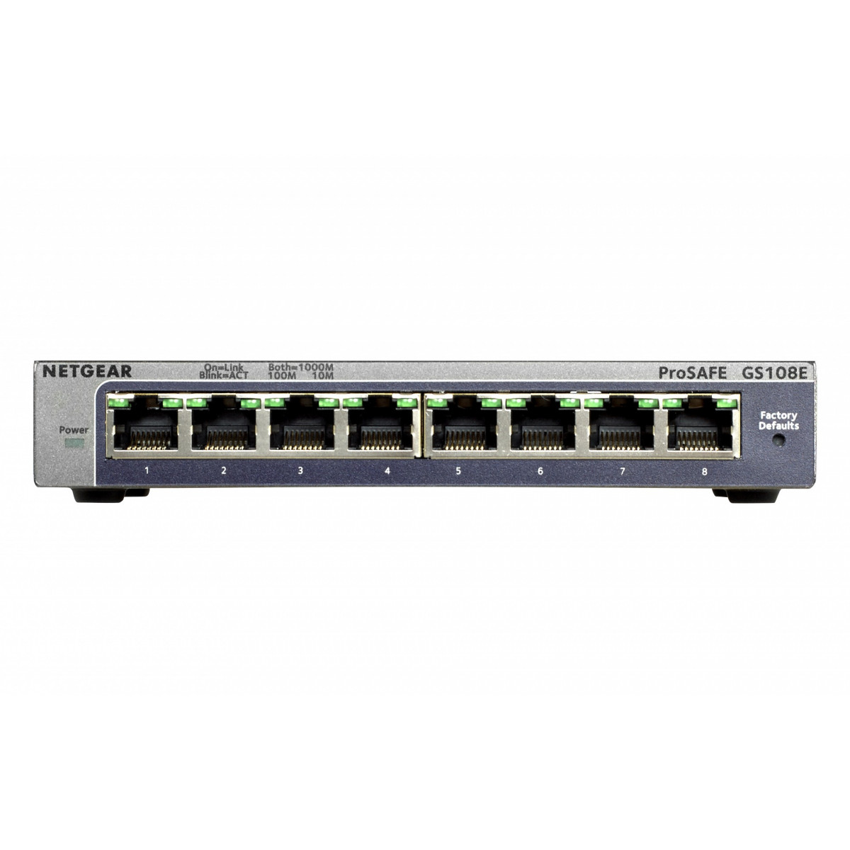 Netgear GS108E. Tipo di porte RJ-45: Gigabit Ethernet (10/100/1000), Quantità di porte RJ-45: 8. Full duplex. Dimensioni tavola MAC: 4000 voci, Capacità di commutazione: 16 Gbit/s. Standard di rete: IEEE 802.1p,IEEE 802.1Q,IEEE 802.3af,IEEE 802.3x. Connettore di alimentazione: Jack DC-ingresso. Certificazione Energy Star