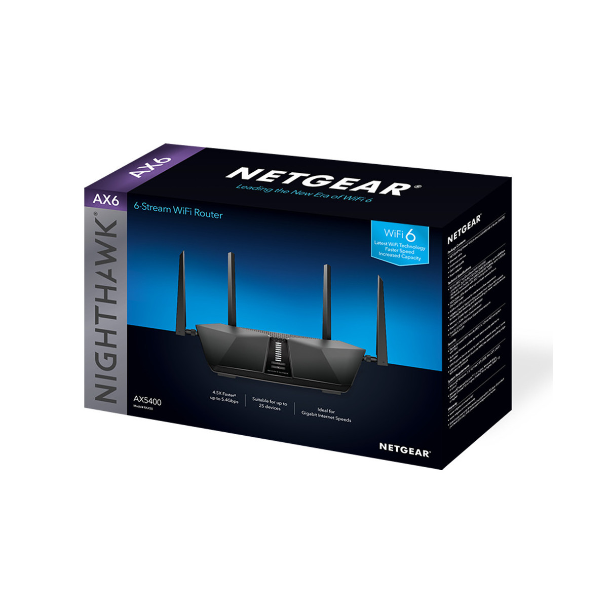 Netgear Nighthawk AX5400. Banda Wi-Fi: Dual-band (2.4 GHz/5 GHz), Wi-Fi standard: Wi-Fi 6 (802.11ax), Intervallo di trasferimento dei dati WLAN (max): 5400 Mbit/s. Tipo di interfaccia LAN Ethernet: Gigabit Ethernet, Standard di rete: IEEE 802.11a,IEEE 802.11ac,IEEE 802.11ax,IEEE 802.11b,IEEE 802.11g,IEEE 802.11i,IEEE 802.11n. Algoritmi di sicurezza supportati: 128-bit AES,WPA3. Tipo di prodotto: Router da tavolo, Colore del prodotto: Nero. Tipo di antenna: Esterno