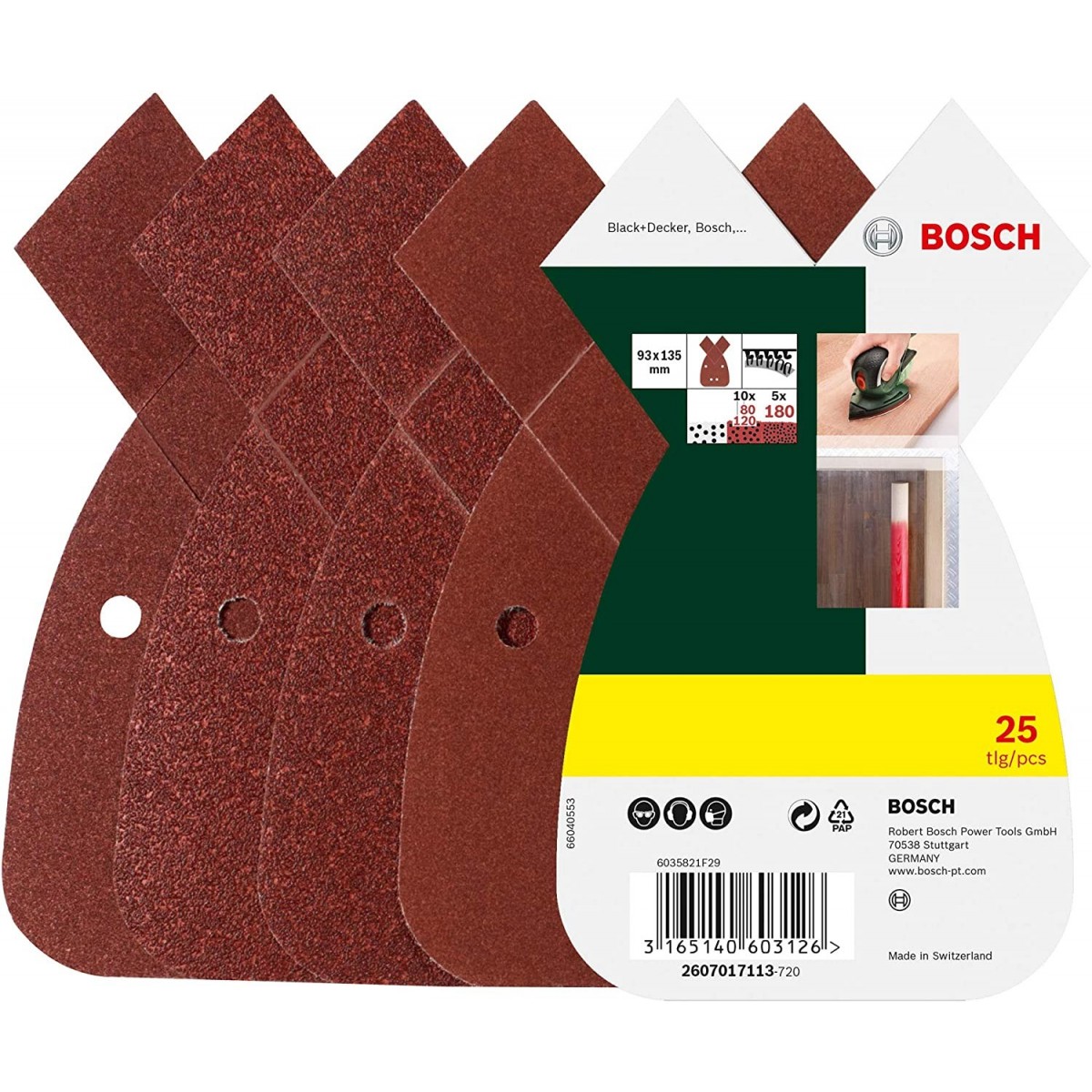 Bosch 25 fogli abrasivi B&D Mouse 25 fogli abrasivi 4 fori 10 fogli grana 80 10 fogli grana 120 5 fogli grana 180 Dimensioni (LxPxH): 170 x 98 x 20 Peso: 0,110 kg
