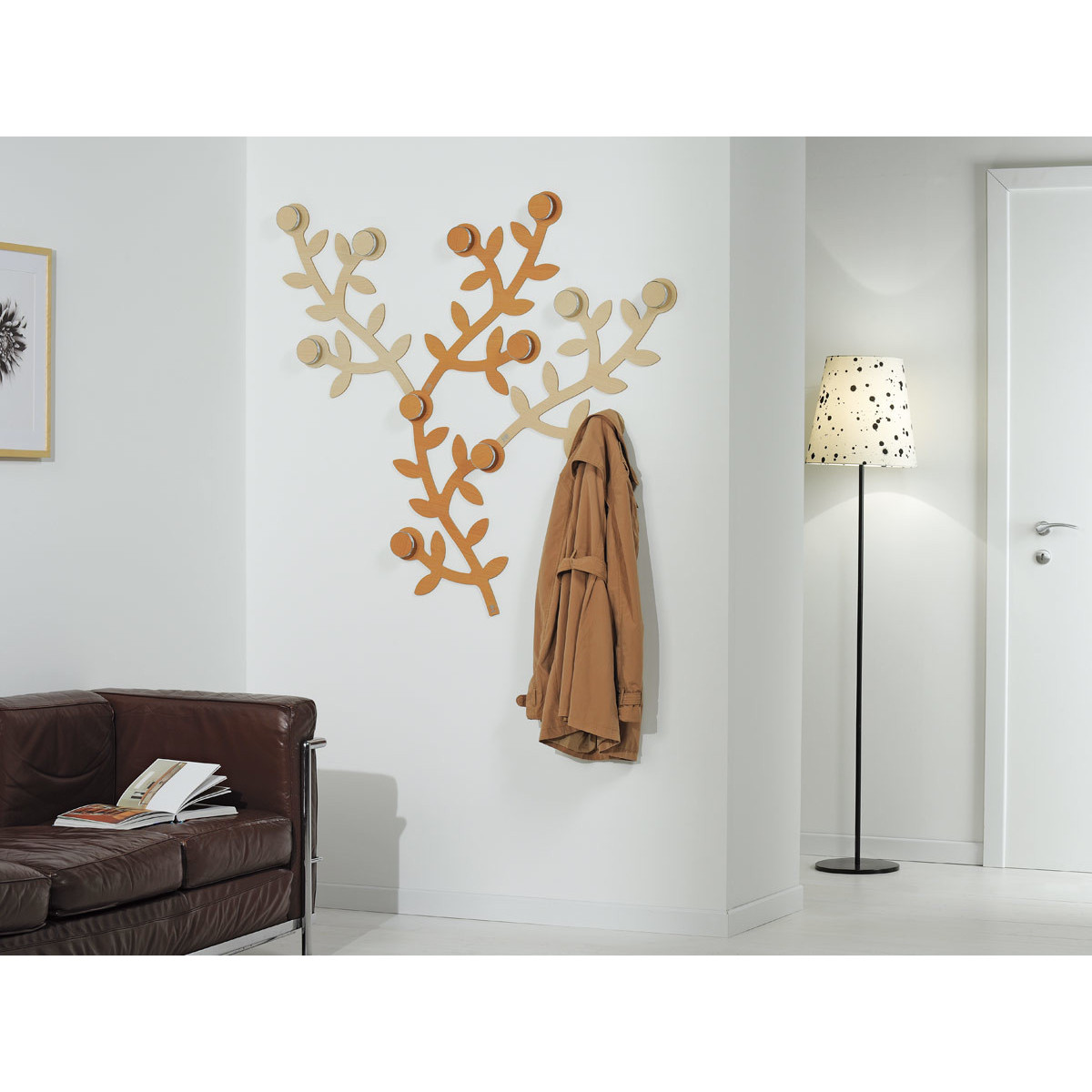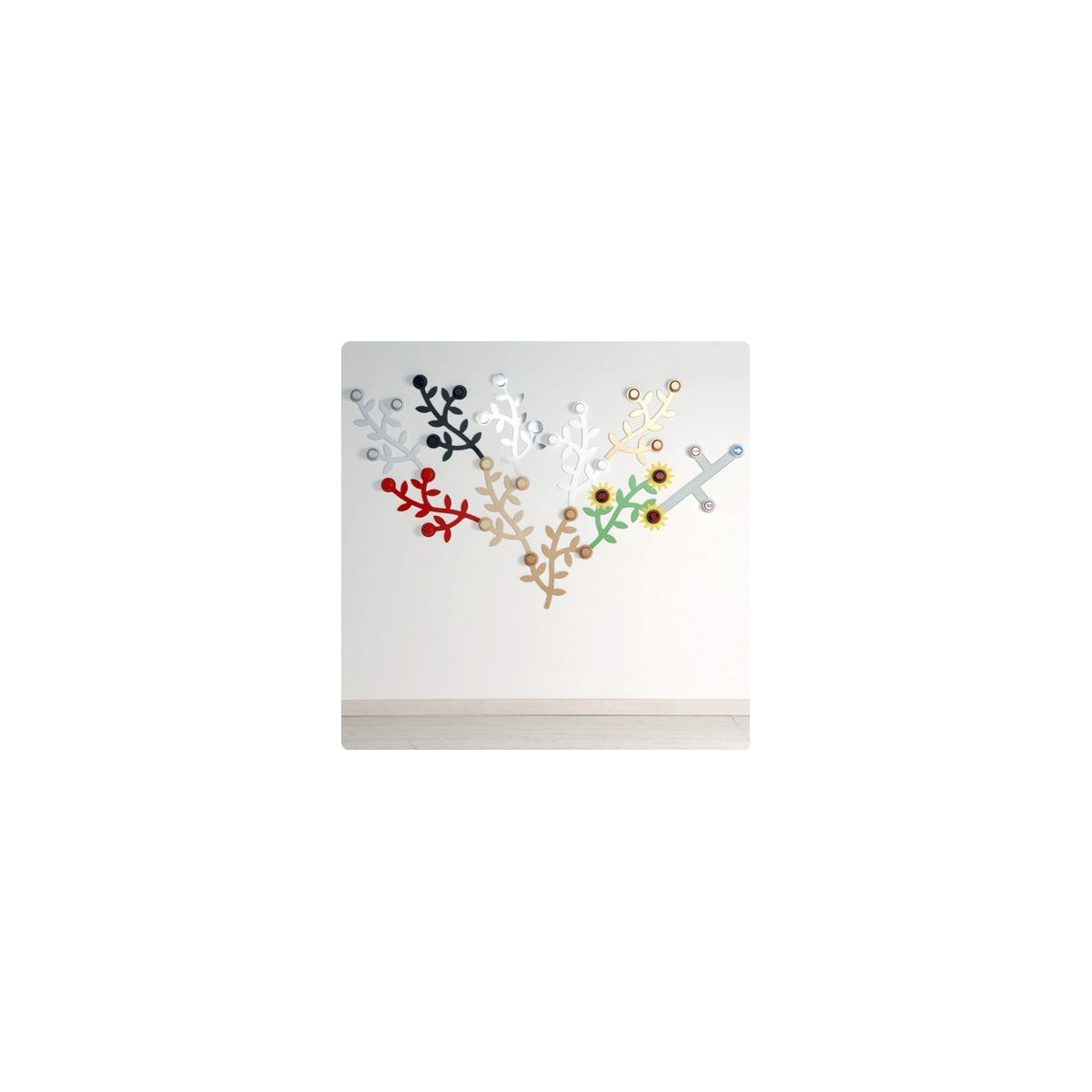 L'appendiabiti da parete Appendialbero di Foppapedretti è composto da un modulo con tre pomoli per appendere giacche e cappotti, componibile a piacere affiancando più moduli che ricordano la forma di rami d'albero.
