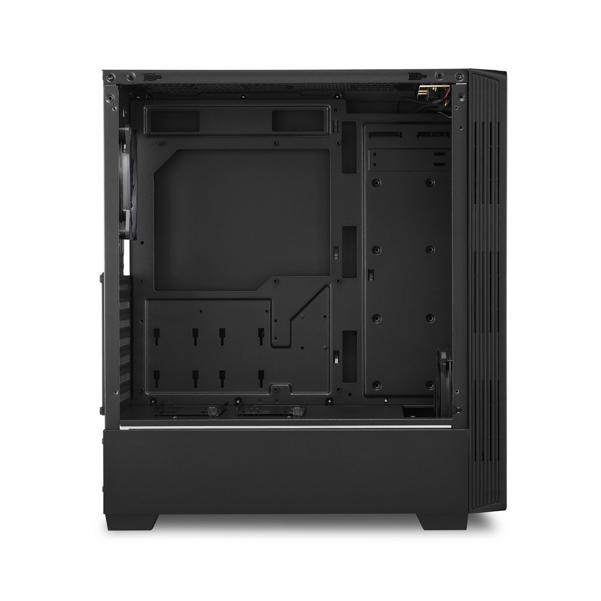 Sharkoon RGB LIT 100. Fattore di forma: Midi Tower, Tipo: PC, Colore del prodotto: Nero. Ventole anteriori installate: 1x 120 mm, Diametro delle ventole frontali supportato: 120 mm, Rear fans installed: 1x 120 mm. Dimensioni di hard disk drive supportati: 2.5,3.5". Larghezza: 206 mm, Profondità: 436 mm, Altezza: 481 mm