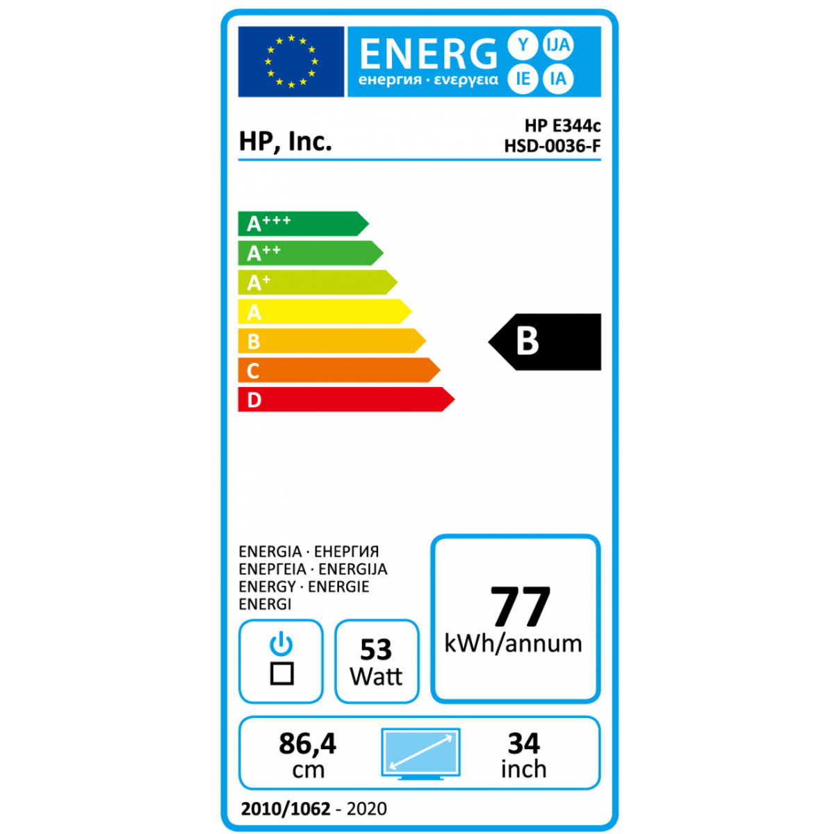 HP E344c. Dimensioni schermo: 86,4 cm (34"), Risoluzione del display: 3440 x 1440 Pixel, Tipologia HD: WQHD, Tecnologia display: LED, Tempo di risposta: 4 ms, Rapporto d'aspetto nativo: 21:9, Angolo di visualizzazione (verticale): 178°. Hub USB integrato. Montaggio standard VESA, Regolazione altezza. Certificazione Energy Star, Colore del prodotto: Nero, Argento